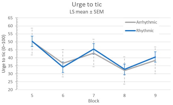 There was no evidence of a carryover effect on urge to tic (sequence p = 0.27), nor was there a difference in urge to tic between visit 1 and visit 2 (p = 0.59). Urge to tic improved during stimulation (l.s. difference 10.8, 95% CI 7.9–13.7; p < 0.0001), but there was no difference between arrhythmic and rhythmic stimulation (l.s. estimate of differential treatment effect −0.6, 95% CI (−6.1, 4.8), treatment p = 0.82, treatment × block p = 0.88) (see Figure 5).