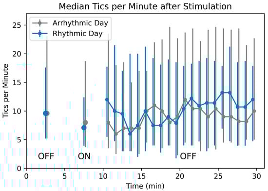 In the 1-min blocks, the stimulation lag variable was not significant for either analysis (all ps > 0.2), suggesting no carryover for more than 20 s after stimulation. More directly, there was no significant change in tic frequency comparing the 20 min after to the 5 min before the last MNS ON block (Block 7, rhythmic p = 0.684, arrhythmic p = 0.356). (Compared to the last stimulation block, Block 8, rhythmic p = 0.314, arrhythmic p = 0.239.) Figure 6 shows median tic frequency before, during, and after the last active stimulation block (see also Supplementary Figure S1).