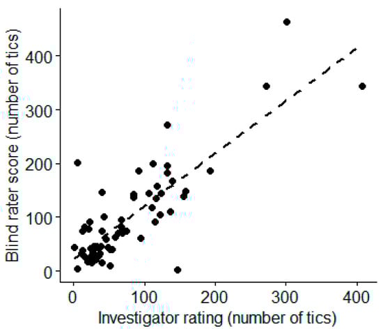 Correlation between investigator and blind rater rating of baseline tic frequency. (Spearman’s rho = 0.66, p < 0.0001).