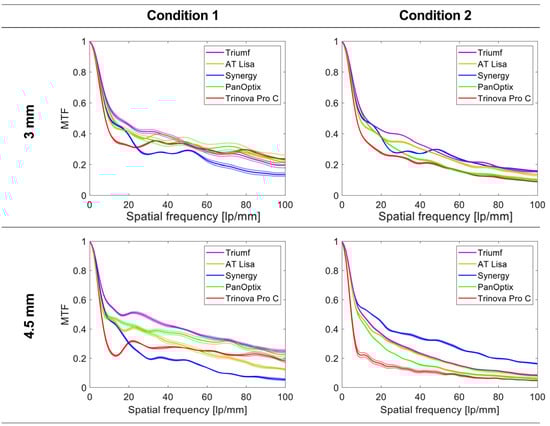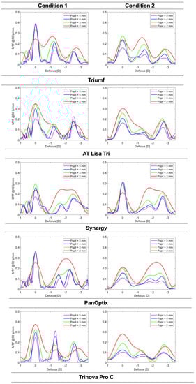 The results of the through-focus modulation transfer function (TF MTF) measurements at a frequency of 50 lp/mm presented in Figure 4 demonstrate how pupil size may affect the behavior of the trifocal IOLs. At 2 mm, the TF analysis revealed the merging of two foci, which for the Triumf, AT Lisa, and Trinova (only Condition 2) affected the far-intermediate distance, but for the Synergy and the PanOptix, the intermediate-near distance. Far-focus MTF was improved for the AT Lisa and the Trinova, but it weakened for the remaining IOLs. At 3 mm, all IOLs exhibited a trifocal behavior—three peaks corresponding to design foci. Still, PanOptix’s intermediate focus was only slightly marked. The Trinova demonstrated the largest pupil-dependency with higher MTF values at the intermediate than at the near focus when the aperture was increased to 4 mm (Condition 1). In Condition 2, however, Trinvoa’s foci are less distinct and have close MTF values. Otherwise, no major differences were observed between Conditions 1 and 2. At 5 mm, the Trinova demonstrated an intermediate focus dominance, while AT Lisa’s MTF was the highest at the near range. The PanOptix and the Triumf showed a good optical performance at far in Condition 1, but for the Synergy, the same conclusion can be made on its far MTF in Condition 2.