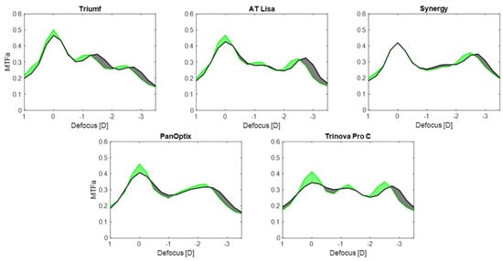 The area under the modulation transfer function (MTFa) of the studied IOLs: from measurements obtained at 3 mm and a defocus range from +1 D to −3.5 D. Monochromatic light with an aberration-neutral corneal model was applied in Condition 1 (green lines), and polychromatic light with a population level of corneal spherical aberration in Condition 2 (black lines). Green-shaded areas indicate an improved MTFa in Condition 1 over Condition 2, and black-shaded areas denote a higher optical quality in Condition 2.