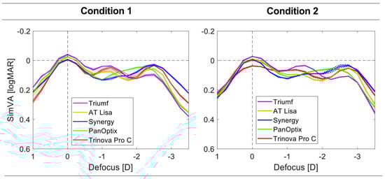 The simulated visual acuity (SimVA) of the trifocal IOLs was derived from optical assessment at 3 mm under two conditions: Condition 1 had the lenses tested in monochromatic light with an aberration-neutral corneal model. Condition 2 used polychromatic light which had a population level of corneal spherical aberration. The dotted lines show the values of each lens separately; the solid lines refer to the average of two samples.