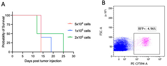 Ly27085-Luc is a lymphoma model with high penetrance and low latency. (A) Kaplan-Meier survival analysis of mice injected intravenously with 5 × 104 (red line), 1 × 105 (blue line), and 2 × 105 (green line) Ly27805-Luc cells. The Mantel-Cox test was performed to assess statistical differences in survival between the three groups (n = 5 per experimental condition). (B) Representative flow cytometry plots showing percentage of RFP+ cells within the spleen of a control mouse. Cells were gated according to physical parameters.