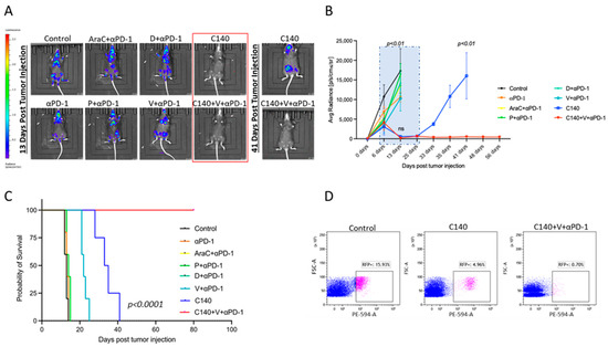 To assess the efficacy of our TT approach [4,5], we injected C57BL/6J mice with 1 × 105 Ly27805-Luc cells and treated them with several chemotherapeutic agents used in the clinic for B-cell lymphoma therapy, the anti-PD-1 ICI, and chemotherapeutic agents combined to ICI. We measured tumor growth by bioluminescence signals as shown in Figure 2A,B. In vivo studies indicated that intermittent (i.e., every 6 days, in a metronomic fashion) C140 was more effective than any other combinatorial regimens including ICI plus AraC, D, or P at their regular preclinical dosages. Both C140 alone and TT initially abrogated tumor growth, in line with our previous studies on TNBC [4,9]. Therefore, after interrupting the treatments, we prolonged the experimental observational time to more than 80 days and we found that the TT association with V and anti-PD-1 significantly increased the preclinical efficacy of C140 (p < 0.01). In addition, TT dramatically improved the overall survival rate compared with other combinatorial therapies (Figure 2C). All the C140-treated mice succumbed around 30–40 days after tumor injection, whereas the TT-treated mice were alive and without any signs of lymphoma (p < 0.0001) up to day 80, at the end of the observational study. At the end of the experiment, the animals were sacrificed, and the RFP signal was evaluated in the spleen, as shown in Figure 2D. In accordance with the luciferase signal, RFP-positive cells dramatically dropped after TT.