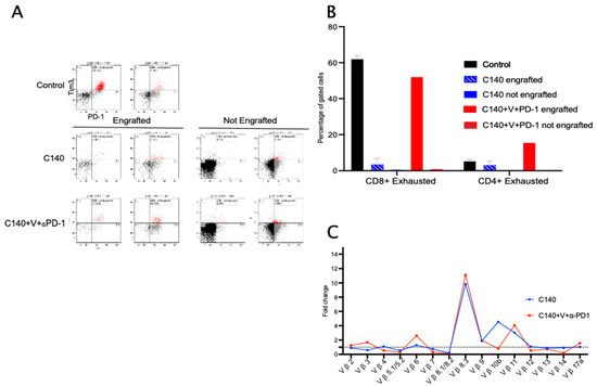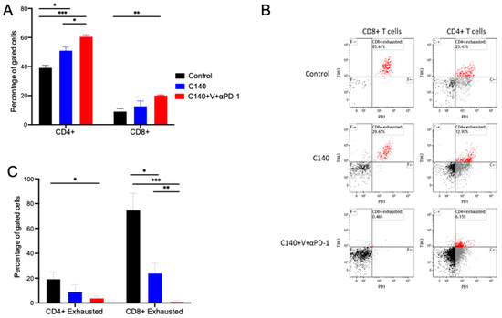 TT reshapes tumor infiltrating lymphocytes and reduces exhausted CD3+CD4+ and CD3+CD8+ T cells. (A) Percentage of CD3+CD4+ and CD3+CD8+ cells in the spleen of control (black), C140- (blue), and C140+V+anti-PD-1-treated mice (red). The Shapiro–Wilk test was performed to assess normal distribution, and thus 2-tails Student’s t test’ was applied. (* p < 0.05, ** p < 0.01, *** p < 0.001) (n = 5 per experimental condition). (B) Representative flow cytometry plots showing the percentage of exhausted CD3+CD8+ cells (defined as CD3+CD8+PD-1+TIM3+, on the left) and of exhausted CD3+CD4+ cells (defined as CD3+CD4+PD-1+TIM3+, on the right) within the spleen of a control (upper panel), C140- (middle), and C140+V+anti-PD-1-treated mouse (bottom panel). Cells were gated according to physical parameters. (C) Quantification of exhausted CD3+CD8+ cells (defined as CD3+CD8+PD-1+TIM3+) and of exhausted CD3+CD4+ cells (defined as CD3+CD4+PD-1+TIM3+) within the spleen of control, C140-treated, and C140+V+anti-PD-1-treated mice. The Shapiro–Wilk test was performed to define normal distribution, and thus 2-tails Student’s t test’ was applied (* p < 0.05, ** p < 0.01, *** p < 0.001) (n = 5 per experimental condition).