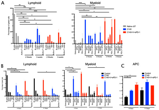 We first focused on the changes at two different time points (2 and 3 weeks) within the myeloid and lymphoid cell compartments after C140 or TT treatments (Figure 5A). As a control, we investigated five un-injected, untreated mice. We then focused on the same populations 4 and 11 days after the lymphoma re-challenge (Figure 5B,C).