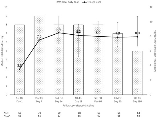 De novo patients were initiated on a median (Q1, Q3) dose of 8.0 (7.0, 8.0) mg per day, increasing to 9.0 (8.0, 10.0) mg after one week and subsequently decreasing to 5.0 (2.0, 6.0) mg at 6 months (Figure 2). The dose was decreased by a median (Q1, Q3) of 41.4% (−61.3%, −18.3%, p < 0.001) between initiation and 6 months (n = 60 with values at initiation and 6 months). The median (Q1, Q3) tacrolimus trough level increased steadily from 3.5 ng/mL (2.4, 6.1) at initiation to 8.5 ng/mL (5.6, 10.0) after two weeks and remained stable at approximately 8 ± 0.15 ng/mL thereafter (Figure 2). The median increase in trough level after stabilization (i.e., at the follow-up visit after a median of 7 days) did not change until the end of observation at month 6 (7.2% [−23.1%, 58.8%] median [Q1, Q3] increase, p = 0.361). The mean (SD) time to achieve tacrolimus target trough levels was 6.4 (4.6) days after a mean (SD) of 4.4 (4.0) dose adjustments.