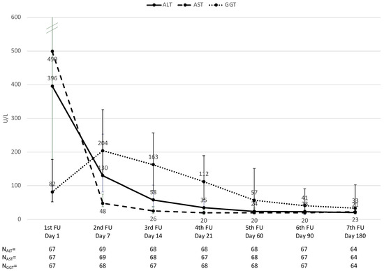Liver function over time. AST, aspartate aminotransferase; ALT, alanine aminotransferase; GGT, gamma-glutamyl transferase. Note: the time points for each measurement are depicted as per the study protocol and correlate with the median actual time points. For the analysis, patients were assigned to visit numbers 1 to 8 according to their individual schedules.
