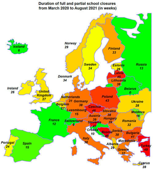 Duration of full and partial school closures in chosen Europe countries from March 2020 to August 2021 (Countries with a long period of school closures are marked with shades of red, and those with the shortest duration of distance learning are marked with shades of green.) [].
