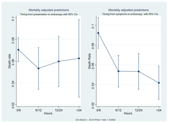 Death occurred in 209/3166 patients (6.6%). The demographics, descriptive data and significant outcomes of all patients (both in- and outpatients) are shown in Table 1. For all patients (overall population), the mean time lapsed from the onset of symptoms to endoscopy was 17.3 h (95% C.I. = 17–18.1 h), while the mean time lapsed from presentation to endoscopy was 8.5 h (95% C.I. = 8.1–9.3 h), with a statistically significant difference of 9.2 h (95% C.I. = 8.3–10.1 h; p < 0.001). The demographics, baseline characteristics and outcomes of the patients in the two timeframe groups are shown in the Supplementary Materials (Tables S1–S8).