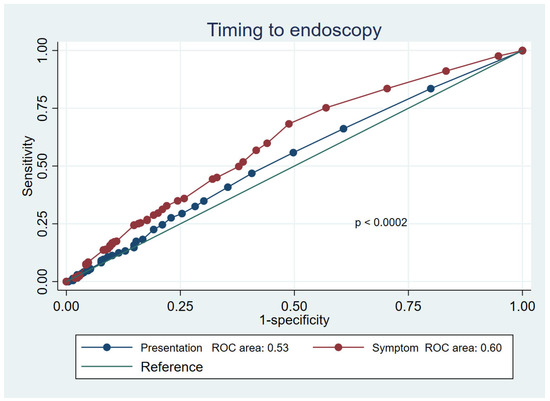 Assuming that the area under the receiver operating characteristic (AUROC) curve was 0.51 for mortality in the presentation-to-endoscopy group, and at least 10% more in the symptoms-to-endoscopy group, with an α error of 5%, a power of 90%, a rank correlation of 0.4 and a mortality rate of 5.4% [17], we determined that we needed a sample of 2570 patients. The selected parameters were analyzed using appropriate descriptive statistics (i.e., mean, standard deviation (SD), median, interquartile range, proportion and 95% confidence interval (C.I.)). A comparison of the continuous variables was performed using an appropriate one-way analysis of variance. The proportions were compared using chi-squared and Fisher’s exact tests, as appropriate. As we assumed that the symptoms-to-endoscopy and presentation-to-endoscopy times were predictive factors for mortality, they were included in a multiple logistic regression model to evaluate their independent role. The results were presented as odds ratios (ORs) with 95% confidence intervals (C.I.s). An AUROC with a 95% C.I. was derived using the routine L-ROC to evaluate the discriminative performance of mortality prediction. The two performance ROC curves were subsequently compared to establish the similarity between the two ROC areas using the DeLong method [18]. All statistical analyses were performed using STATA software, version 15.1 (StataCorpLp, College Station, TX, USA), according to the transparent reporting of a multivariable prediction model for individual prognosis or diagnosis (TRIPOD) statement.