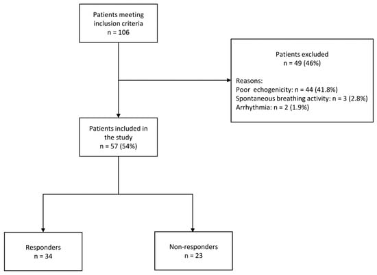During the study period (October 2019 to July 2022), 106 patients met all inclusion criteria. Forty-four (41.5%) were excluded due to poor echogenicity, in agreement with previous studies [,], three (2.8%) due to spontaneous breathing activity impeding the respiratory occlusion tests and two (1.9%) due to hemodynamic instability induced by arrhythmia (Figure 1). The characteristics of the included 57 patients are summarized in Table 1. Thirty-four patients (59.6%) were fluid responders. There were no significant differences in patient characteristics between the study groups, except for the difference in EuroSCORE II (0.89 [0.68–1.47] for responders versus 1.25 [0.91–1.62] for non-responders).