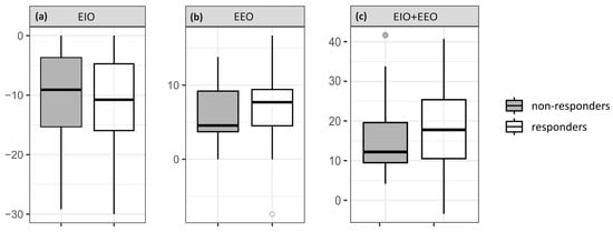 Boxplots displaying the changes in CI for (a) EIO, (b) EEO and (c) combined EIO + EEO.