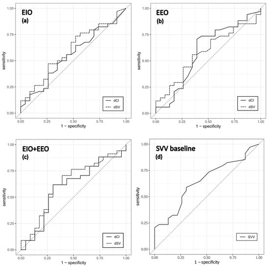In the case of baseline SVV, the sensitivity and specificity were 58.8% and 69.6%, respectively, for a cut-off point of 14% with ROC AUC of 0.645. The ROC curves for the summary changes in CI and SV after an EEO and EIO as well as for baseline SVV are displayed in Figure 3. A summary of cut-off points, sensitivity, specificity and positive and negative predictive values is presented in Table 5.