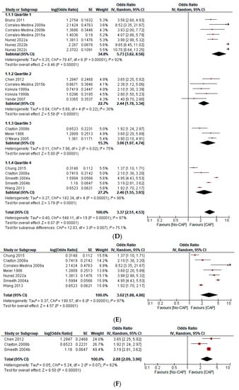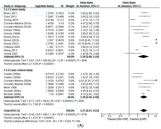 To the best of our knowledge, this is the first “non-proportional” meta-analysis on CAP and CVD that reports ORs instead of proportions as a measure of effect size. A proportional meta-analysis is a data synthesis method that allows one to calculate a pooled, overall proportion from several individual proportions for a certain event instead of estimating an effect size, as conducted in a “traditional meta-analysis” [90,91]. That is, a proportional meta-analysis can include dichotomous data reported as a percentage. Proportional meta-analysis is encouraged when conducting systematic reviews of prevalence, incidence, and maybe, interventions and therapies where appropriate [92]. However, for dichotomous outcomes, the Cochrane Handbook does not recommend using proportional meta-analysis [14].