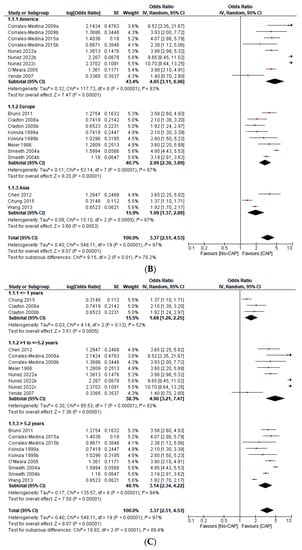 This study includes 276,109 participants, 18,298 first ACS events, 12,421 first stroke events, 119 arrhythmic events, 75 episodes of new onset or worsening HF, 3379 deaths, and 218 “incident CVD events” (Table 1). CAP increases the odds of ACS (OR 3.02; 95% CI 1.88–4.86), stroke (OR 2.88; 95% CI 2.09–3.96), mortality (OR 3.22; 95% CI 2.42–4.27), and all CVD events (OR 3.37; 95% CI 2.51–4.53). However, heterogeneity was significant (I2 = 97%, p < 0.001). The sensitivity analysis—with outliers excluded—did not significantly affect the overall estimate. In the subgroup analysis, we found statistically significant differences according to the continent of origin of the study (I2 = 78.2%, p < 0.10), the length of follow-up (I2 = 89.4%, p < 0.10), and the sample size (I2 = 75.1%, p < 0.10). Conversely, we did not find statistically significant differences between subgroups according to the study design (I2 = 0%, p < 0.93) (Figure 2A–G). Due to the limited data available, it was impossible to perform subgroup analysis according to other variables (i.e., the participants’ sex, the interval from exposition to the outcome, or cardiovascular risk levels). Similarly, we did not perform meta-regression analyses due to the limited number of studies.