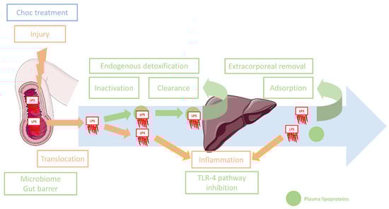 In humans, several mechanisms prevent LPS in the gut from reaching the blood flow []. For instance, intra-luminal enzymes, proteins and the mucus layer provide an in situ protective mechanism against LPS translocation. The intestinal epithelium and tight junctions also prevent LPS translocation. Nevertheless, despite these mechanisms and even in the absence of acute gastro-intestinal injury, low grade endotoxemia can occur []. In this situation, because LPS are too large to transit through the paracellular space, a transcellular pathway is likely. Indeed, LPS from the gut lumen might cross the intestinal epithelial layer through endocytosis, followed by exocytosis at the basal enterocyte pole by goblet cell-associated antigen passage []. Otherwise, LPS might be absorbed similar to dietary fatty acid via chylomicron synthesis [,]. Once they have entered the portal circulation, part of LPS are transferred to lipoproteins by the action of the phospholipid transfer protein (PLTP). LPS bound to lipoproteins are inactivated (it cannot riggers TLR-4 response) []. LPS transfer and binding to lipoproteins also promote hepatic LPS elimination. Indeed, the liver represents an important barrier to prevent gut-derived LPS entry into the systemic circulation by exerting a first hepatic pass effect [].