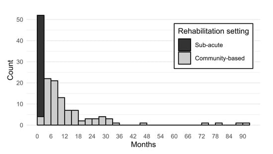 Out of 160 recruited, 8 participants were excluded (cerebral tumor, n = 6; transient ischemic attack, n = 2). In addition, three participants did not complete the assessment. Thus, the final sample size was 149 (n = 100 in community-based rehabilitation, n = 49 in sub-acute rehabilitation). Table 1 presents sample characteristics. Notably, the majority had a stroke (92%), and time since injury varied substantially across rehabilitation settings (Figure 1). In community-based rehabilitation, median time since injury was 9 months, ranging from 1–161 months. For stroke inpatients, median time since injury was 13 days, ranging from 5–47 days.