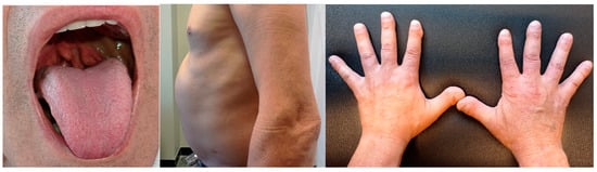 Physical examination: mild blood pressure elevation, BMI within the normal range, yellowing of sclera, orange-colored tonsils (Figure 1—left), red-colored and intensely itchy nodules on the nape of the neck (diagnosed as prurigo nodularis of Hyde), aortic and mitral stenosis murmurs, distended abdomen with massive hepatosplenomegaly (Figure 1—middle), umbilical hernia, vascular murmurs at both femoral arteries, clubbing (Figure 1—right) and absence of both Achilles tendon reflexes. The patient did not show any physical sign of dyslipidemia such as tendon xanthomas, xanthelasma palpebrarum, or corneal arcus.