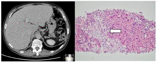 (Left): Abdominal computed tomography showing hepatomegaly. (Right): Hematoxylin and eosin (HE) staining of liver tissue (original magnification ×20): note the presence of clusters of foamy histiocytes involving liver tissue due to lipid deposition (white arrow).