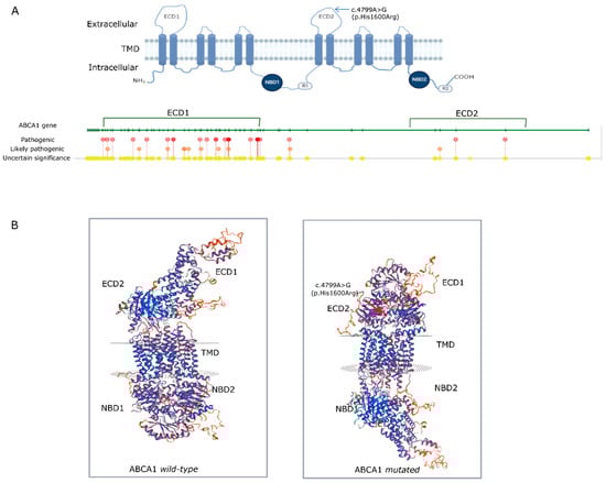 (A): Graphical model of the protein domains of ABCA1 along with the ABCA1 gene representation with the variants identified in ClinVar. (B): Predicted dimensional model of the wild-type ABCA1 protein without the variant and the ABCA1 variant c.4799A>G (p. His1600Arg), highlighted with a red arrow, reflecting the functional consequences of single-point mutation by substitution of the polar amino acid histidine to the positively charged arginine. ECD—extracellular domain; TMD—transmembrane domains; NBD—nucleotide-binding domains; R1 and R2: regulatory domains.