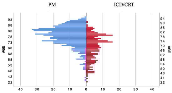 Age distribution in patients with pacemaker (PM) and implantable cardioverter defibrillator (ICD)/cardiac resynchronization therapy (CRT).
