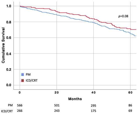 Cumulative incidence of all-cause death in patients with pacemaker (PM) and implantable cardioverter defibrillator (ICD)/cardiac resynchronization therapy (CRT) estimated using the Kaplan–Meier method.