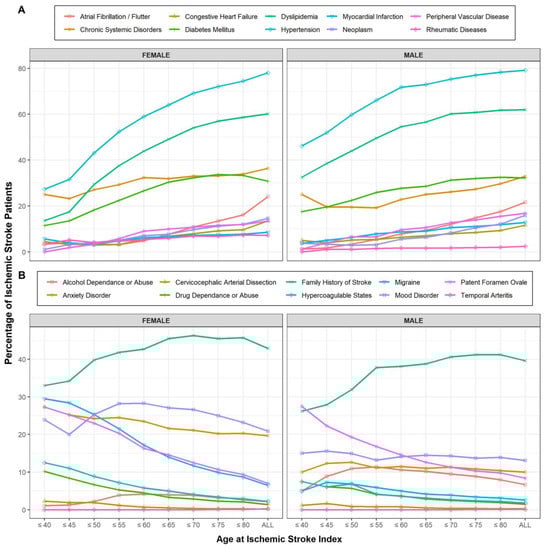 Generally, three main risk factors patterns were measured: (1) an increase in prevalence with increasing age, (2) a decrease in prevalence with increasing age, and (3) relative steadiness with increasing age. For example, in women, migraine (29.5% of <40 versus 9.7% of <80) and PFO (27.3% of <40 versus 9.4% of <80) demonstrated a declining prevalence. In men, PFO followed the same pattern (27.5% in <40 versus 9.8% in <80). In women, hypertension (7.3% in <40 versus 74.5% in <80), dyslipidemia (13.6% in <40 versus 58.7% in <80), and diabetes (11.4% in <40 versus 33.3% in <80) are examples of variables that demonstrated an opposite pattern, whereby the prevalence increased with age at IS onset. In men, hypertension (46.2% in <40 versus 78.9% in <80), dyslipidemia (32.5% in <40 versus 61.8% in <80), neoplasm (3.8% in <40 versus 12.1% in <80), and MI (3.8% in <40 versus 11.8% in <80) followed this pattern. Some variables, such as BMI, arteriopathies, cervicocephalic dissection in women, mood disorders, smoking, and cervicocephalic dissection in men, did not fluctuate with respect to IS age of onset. A list of variables and the respective percentages for the different age brackets in both males and females are summarized in Table S4 (females) and Table S5 (males). Figure 1A,B shows the changing prevalence of comorbidities with respect to the age of IS onset.