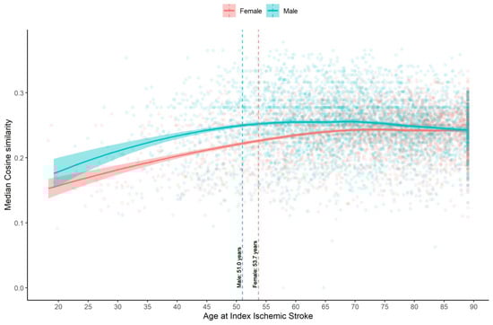 Scatter plot of median cosine similarity and age at index ischemic stroke date with a smoothed line, using loess regression.