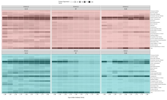 We used three algorithms—logistic regression (generalized linear models, GLM), in [27] extreme gradient boosting (XGB), [28] and random forest (RF) [29]—to train classifiers based on IS (cases) and non-IS patients (controls) for different age brackets. Following the classification, we extracted the feature importance, based on the 23 variables, for the different age groups; the models were created separately for males and females. The relative feature importance of each variable in each age bracket, and for males and females, was used to identify the changing comorbidity patterns. We created 102 models, based on 3 algorithms, 17 age brackets, and 2 sexes. The 17 age brackets included IS index age below 40, 45, 46, 47, 48, 49, 50, 51, 52, 53, 54, 55, 60, 65, 70, 75, and 80. Given that most studies used an age bracket in the range of 45–55, we designed our study to have a higher resolution for this age range.