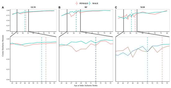 The trend of cosine similarity versus age at index ischemic stroke. Lower cosine similarity scores were indicative of increased dissimilarity, suggesting a change in risk factor profile across that age cutoff. (A) Cosine similarity trend for GLM model. (B) Cosine similarity trend for RF model. (C) Cosine similarity trend for XGB model.