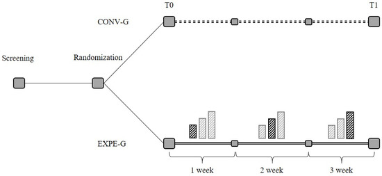 The conceptual framework of the research was developed according to the frequency, intensity, time, type (FITT) principles of therapeutic modalities for physical rehabilitation [36,37]. The method was developed in terms of frequency of use, intensity, type of intervention and time in order to structure a logical treatment protocol. These variables can be manipulated according to the functional, physiological and psychological requirements of the research objective.