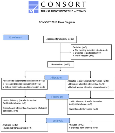 - Schulz, K.F.; Altman, D.G.; Moher, D. CONSORT 2010 Statement: Updated Guidelines for Reporting Parallel Group Randomised Trials. BMC Med. 2010, 1, 100–107. [Google Scholar] [CrossRef]