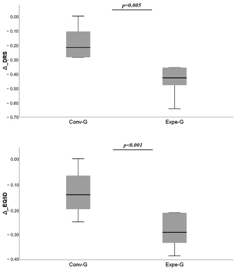 In the between-group comparison, a statistically significant difference was found only in DRS (p = 0.001) and EQ-5D (p < 0.001), where there was a greater improvement in the experimental group (Figure 3).