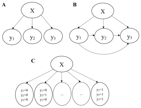Three problem transformation methods were used to tackle the multilabel classification problem by transforming it into other well-established learning problems, including binary relevance (BR), classifier chains (CC), and label power set (LP) [21]. The modes of BR, CC, and LP are depicted in Figure 1.