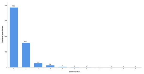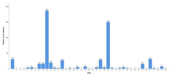 A total of 4038 (34.39%) patient prescriptions were with PIMs based on the pharmacists’ review. Among these prescriptions with PIMs, 896 patient prescriptions had more than one PIM, and a total of 5816 PIMs were identified, as shown in Figure 2. Based on the AGS 2019 Beers criteria [16], 41 types of PIMs were identified in these prescriptions. The common PIMs in Chinese geriatric inpatients were No. 16 (avoiding benzodiazepines; N = 1862; 32.02%), No. 48 (using antipsychotics, diuretics, tramadol, or some types of antidepressants; N = 1501; 25.81%), No. 1 and No. 94 (avoiding anticholinergics; N = 310; 5.33%), and No. 45 (using aspirin for primary prevention of cardiovascular disease and colorectal cancer with caution in adults ≥70 years; N = 292; 0.5%), as shown in Figure 3.
