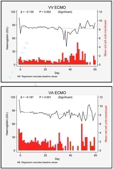 There was no difference in either the absolute level of haemoglobin or its trend between the two modes of ECMO. Haemoglobin levels decreased slowly but significantly over time (Figure 1).