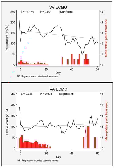 On average, over time, patients on VV ECMO had platelet counts 44 × 109/L higher than those on VA ECMO (β = +44, p ≤ 0.001) (Figure 2).