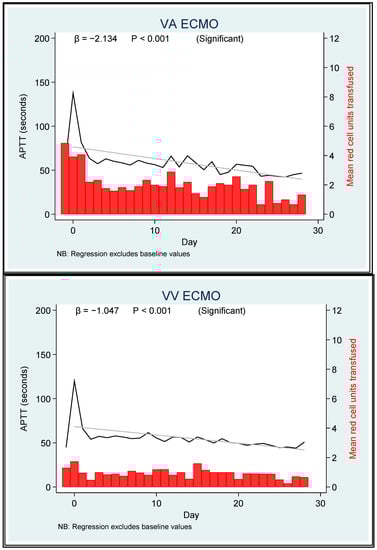 The relationships of the number of PRBC units transfused with the independent predictors of APTT, outcome, ECMO mode, and time were examined in a cross-sectional time series mixed effect univariate linear regression model. The significant positive predictors of red cell transfusion between Day 1 and Day 28 were an increasing APTT (p < 0.001) and the VA ECMO mode (p = 0.005). Overall, 3262 units of PRBC were transfused during the study period (Table 5).