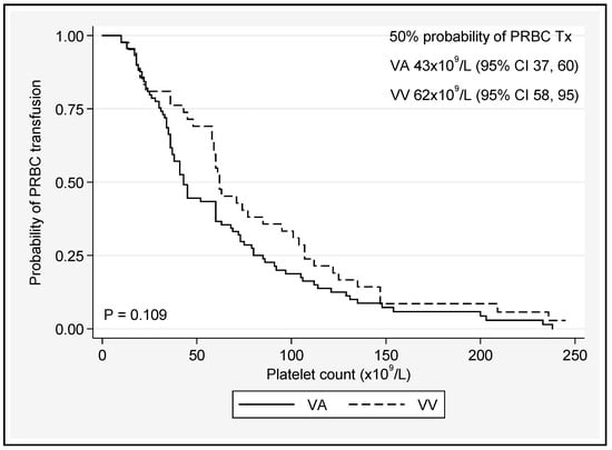 The platelet nadir during ECMO has previously been associated with PRBC transfusion [31], and in the current study, a platelet count of <50 cells/mm3 and a fibrinogen concentration of <1.8 g/L increased the probability of PRBC transfusion by 50%. There was also a trend towards transfusion at a platelet count of 43,000 cells/mm3 on VAECMO and 62,000 cells/mm3 on VVECMO, although this difference did not reach significance. In this study, we were not able to show that the requirement for PRBC transfusion was due to excess bleeding, similar to previous reports [58]. There are emerging and important differences in coagulation status between VAECMO and VVECMO patients which may have implications for personalized anticoagulation approaches by modality [78]. VA ECMO may be associated with a loss of normal cardiac pulsatility, which can produce excess inflammation [20] and acquired Von Willebrand syndrome [27,79]. Furthermore, reductions in transpulmonary blood flow during peripheral VAECMO may limit the breakdown of bradykinin [62] and thus potentiate the contact pathway of coagulation [80]. Aubron et al. found VA ECMO to be associated with increased blood product transfusion compared to VV ECMO. Nonsurvivors of ECMO (both VA and VV) also received greater volumes of blood and platelets, whereas in the multivariate analysis, the volume of RBC units transfused was associated with mortality in VA ECMO alone [9]. The strengths of the current study include the large populations of both VA and VV ECMO patients with consistent data collection methods adding to the repository of knowledge around this important topic.