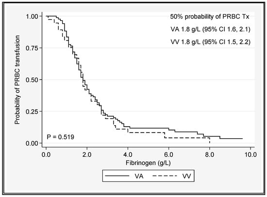 Fibrinogen level cut-off value associated with PRBC transfusion in VA and VV ECMO patients. Tx = transfusion.