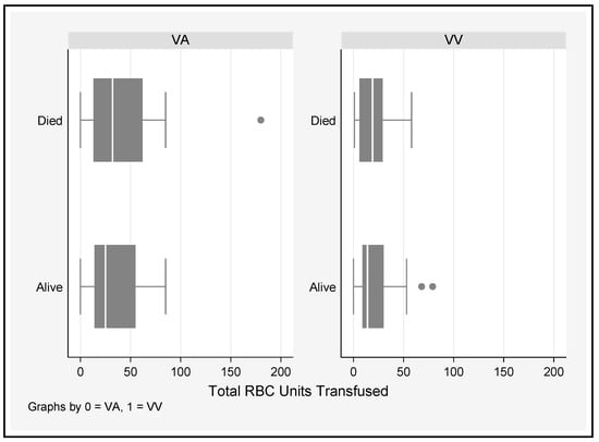 A cut-off value of 50% was chosen, as this is a common cut-off point in time-to-event analyses. There was no significant difference in the total number of PRBC units transfused in survivors and nonsurvivors who underwent either VA or VV ECMO (Figure 6).