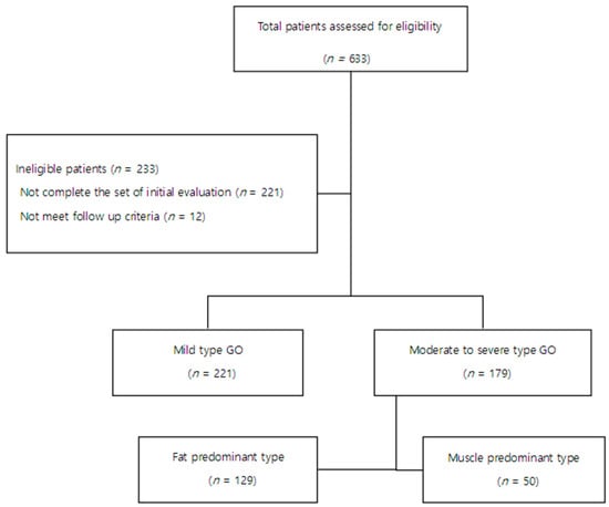 A total of 633 patients referred to the Department of Ophthalmology of Bundang CHA Medical Center for evaluation of GO between October 2002 and February 2021 were assessed for eligibility. Among them, 221 did not complete the initial evaluation for GO, and 12 did not meet the follow-up criteria (Figure 1). Finally, 400 patients diagnosed with GO and followed up at both endocrinology and ophthalmology clinics of our hospital for at least 6 months were included in the study.