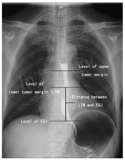In this study, the distance between the lower tumor margin and esophagogastric junction (LED) was used to define the location of the lower tumor margin.