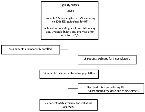 The median duration of follow-up was 11 (25–75th percentile, 8–13) months since S/V was started. During follow-up 3 patients died before the scheduled follow-up echocardiogram, 7 discontinued the drug earlier than 12 months due to side effects (2 because of hypotension, 4 because of chronic kidney disease, 1 because of idiosyncratic reaction). Therefore, 76 patients had data available to compare follow-up versus baseline and specifically to evaluate heart remodeling (Figure 1). S/V was titrated to a maximally tolerated dose in each patient (median 200 mg; 100–400); 23 out of 76 patients (27%) were able to tolerate the highest dose.