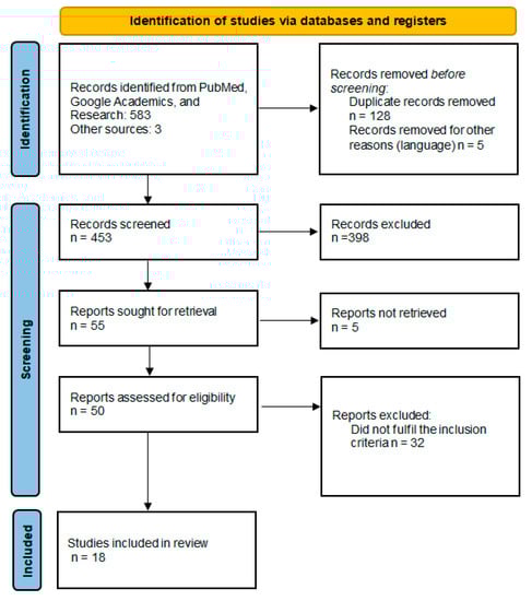 Using the search method, 586 articles were identified from the databases. A total of 128 duplicate articles were removed from the screening, and five were written in languages other than those being considered. Of the 453 articles remaining after screening by title and abstract, 398 were excluded as they referred to another subject. Of the 50 articles assessed for eligibility, 18 met the inclusion criteria (Figure 1).