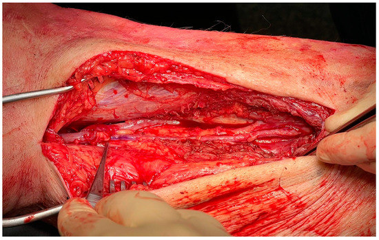 - Slim, H.; Tiwari, A.; Ritter, J.C.; Rashid, H. Outcome of infra-inguinal bypass grafts using vein conduit with less than 3 millime-ters diameter in critical leg ischemia. J. Vasc. Surg. 2011, 53, 421–425. [Google Scholar] [CrossRef]