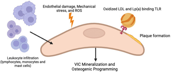 Pathogenesis of CAVD involves lesions from endothelial damage, mechanical stress, and ROS. This allows for oxidized LDL and Lp(a) infiltration, plaque formation, and subsequent leukocytic infiltration of VICs. This leads to progressive mineralization and osteogenic programming of VICs [4,6].