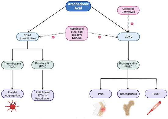 A summary of the cyclooxygenase (COX) pathways and their effects. Celecoxib and its derivatives selectively block the COX-2 pathway, inhibiting pain, inflammation, and fever without impacting platelet aggregation [7,8].