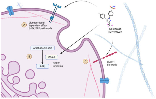 A summary of the pathways celecoxib and its derivatives that are proposed to affect (A) the glucocorticoid-dependent effect (possibly MEK/ERK), (B) the inhibition of COX-2, and (C) the blockage of the CDH11 transmembrane protein [9,19,23].